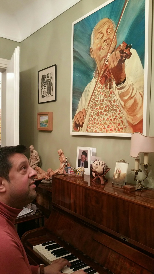 | Jacques Gay jouant souvent devant le portrait de Stephane Grappelli lors d'un sejour chez lui fin debut 2018. |