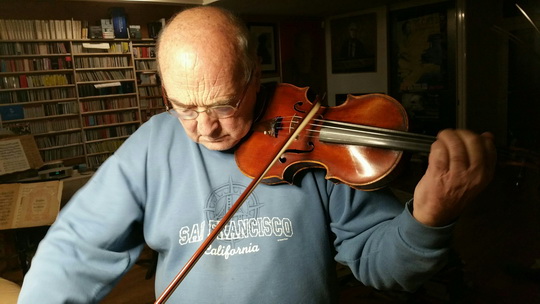 Bruno Monsaingeon chez lui lors d'une visite de Jacques Gay, en train de jouer avec inspiration le Francesco Gobetti de 1714, luthier majeur de Venise, doté d'une émission rapide et à la sonorité à la fois si douce et si bien timbrée, que Jacques lui a amené.
