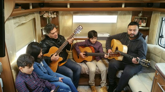 | Tournage dans la caravane de Ninine Garcia, à l'aire d'accueil DJANGO REINHARDT près de Paris avec son fils Rocky Garcia et les enfants Revens, très prometteur guitariste, Nicky chanteuse à la voix d'or, et Stan jeune guitariste ici à la guitare rythmique. |