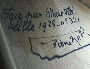 Lorsqu'il partait en voyage il amenait souvent le Pierre Hel, mais celui ci a beaucoup perdu de sa superbe après une, puis 2 craquelures réparées sur le flanc gauche, (partie vibrante du violon si utile pour la rondeur et la volupté des basses) puis une 3ème au pied du chevalet au dessus de la barre d'harmonie.