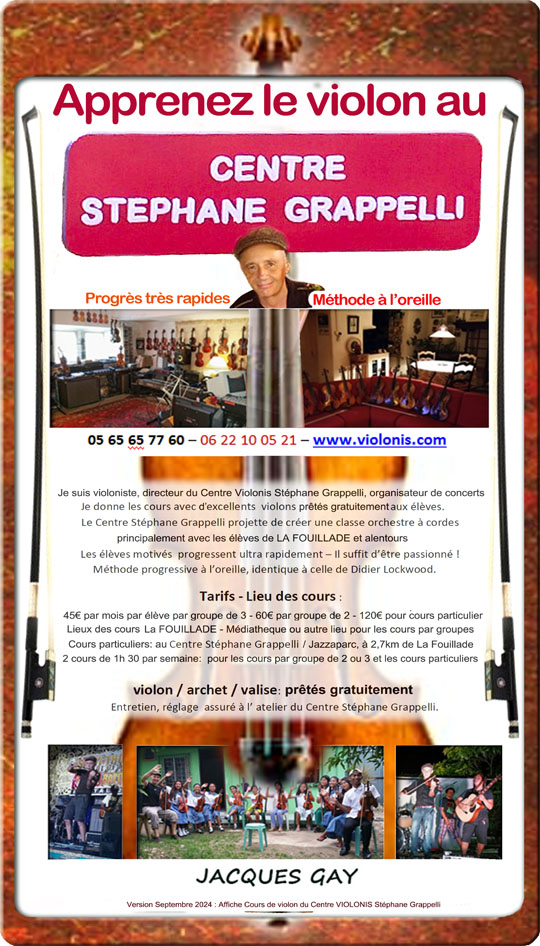 près de NAJAC / LA FOUILLADE / VILLEFRANCHE de ROUERGUE. Ce centre est le seul existant au monde à titre exclusif. Il sera transféré aux USA si cette convention n'intervient pas. La France et L'Aveyron le perdraient alors définitivement. Or Stéphane Grappelli reste le Musicien Français contemporain le plus connu et estimé au Monde avec Jean Luc Ponty, un autre violoniste de Jazz Français qui a aussi fait une immense carrière internationale). La perte de ce Centre très convoité aux USA ferait date étant naturellement médiatisée au plan national, elle mettrait en défaut ceux qui l'auraient inconsidérément laissé disparaitre à jamais. En raison des efforts énormes que nous avons accompli pour lui assurer une vitalité en Aveyron depuis 1990, et de la demande très modeste permettant d'y poursuivre son activité, aucun argument recevable ne pourrait être invoquée par les décideurs pour excuser sa disparition. Ici en Aveyron, au delà de l' activité publique médiatisée de Festival / Stages / Résidences / Compositions / Enregistrements / Mise en ligne internet, qui représentent le corps d'activité à la hauteur de la mission du "Centre Stéphane Grappelli", la convention permettrait pour les étudiants locaux de tous niveaux / tous ages, des alentours du Centre: Bor et Bar / La Fouillade / Najac / Villefranche de Rouergue de béneficier de cours de violon gratuitement ou quasi gratuitement, c'est en tout cas ce que nous souhaitons ardemment car pour les familles en Aveyron c'est la voie possible qui leur permet d'accéder à une pratique, considérée comme réservée aux élites, qu'elles n'avaient pas imaginé être envisageable localement. Pour cela les 4 institutions doivent s'accorder pour financer cette gratuité qui a pour but de vivifier le tisssu local par la création d'un ensemble orchestral à cordes investissant tous les styles d'expression à sa portée: jazz / compositions originales / répertoires classique / musique de l'Inde / folk / musiques du monde. Elle est très peu coûteuse pour elles, il faut le souligner Afin d'aider la prise de décision rapide une affiche de cours de violon au plus bas prix possible a été diffusée à 300 exemplaires, dans les collèges, lycées, écoles, du public et du privé ainsi que sur plusieurs autres points: médiathèques, mairies et autres, dans l'attente de la signature de la convention précitée.